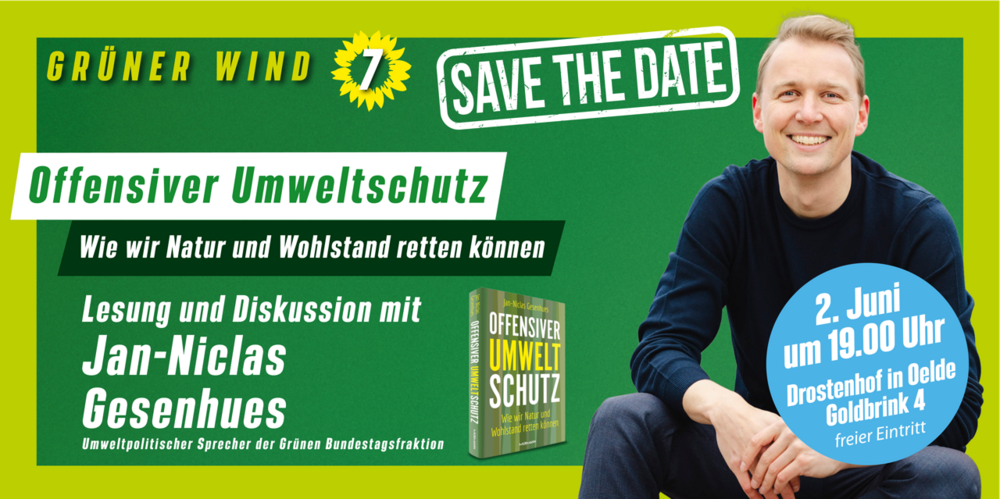 Am 2. Juni - um 19.00 Uhr wird Jan-Niclas Gesenhues MdB für eine Lesung und Diskussion zum Thema "Offensiver Umweltschutz" in den Drostenhof nach Oelde kommen.
